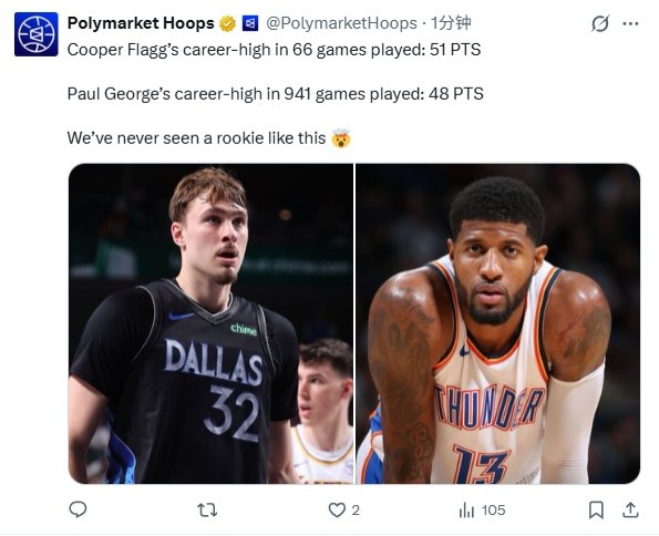 美媒对比,弗拉格66场比赛最高51分;乔治生涯941场最高48分。